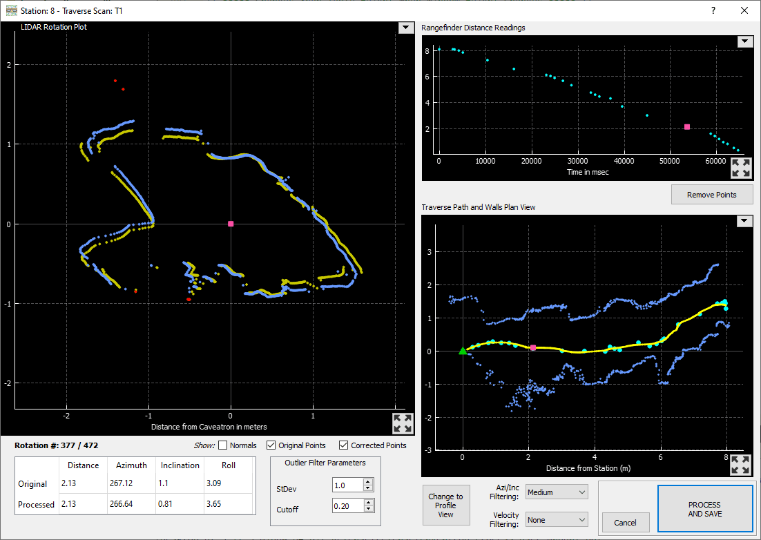 The LIDAR data file from the Caveatron is then loaded into the Caveatron Process bringing up a list of the traverses and room scans. Detailed information about each scan is provided. To begin processing, the user selects one of the scans and selects it to Review. This opens the Scan Review window where the scan data can be viewed in details via several plot and each rotation of the scan can be stepped through to view each single cross-section. Outlier points (noisy data) are indicated for removal and the filtering parameters can be adjusted. Another plot shows the rangefinder distance measurements during the scan so that bad data that slipped through the filtering can be selected for removal. A third plot shows a plan or profile section of the scan and provides drop down menus to select the level of processing desired to smooth the data.