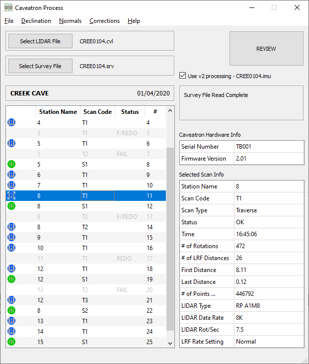 Although the onboard processor handles some basic filtering of the incoming LIDAR and position data during scanning, it doesn't have the capacity to generate the point cloud. That is performed using the CAVEATRON PROCESS application. The first step is to generate an X, Y, Z coordinate file from the station survey file. The file can be loaded directly into CAVEATRON PROCESS and the line plot can be viewed and reference stations and global coordinates set. If the survey contains loop closures or multiple surveys are involved, it is highly recommended to use Walls Cave Mapping Software. The survey file can be directly loaded into Walls for processing and a function in Walls generates the necessary X, Y, Z coordinate file to load back into CAVEATRON PROCESS.